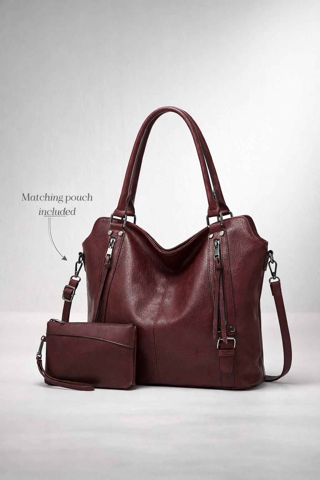 Crafted from supple vegan leather, this tote adapts to your daily load while remaining lightweight and easy to wear. Dual shoulder straps make it comfortable for long days, while the detachable crossbody strap provides versatility on the move. The zipper accents add a modern touch and offer quick-access functionality. Spacious without feeling bulky, it’s an excellent choice for students balancing style and practicality.